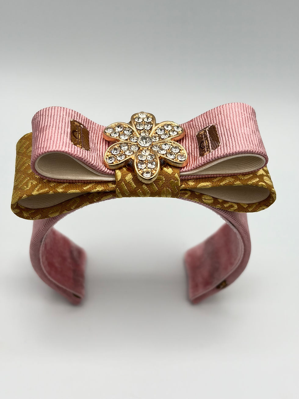 Pink LV trunk pattern cuff with diamanté flower made from a vintage silk LV tie