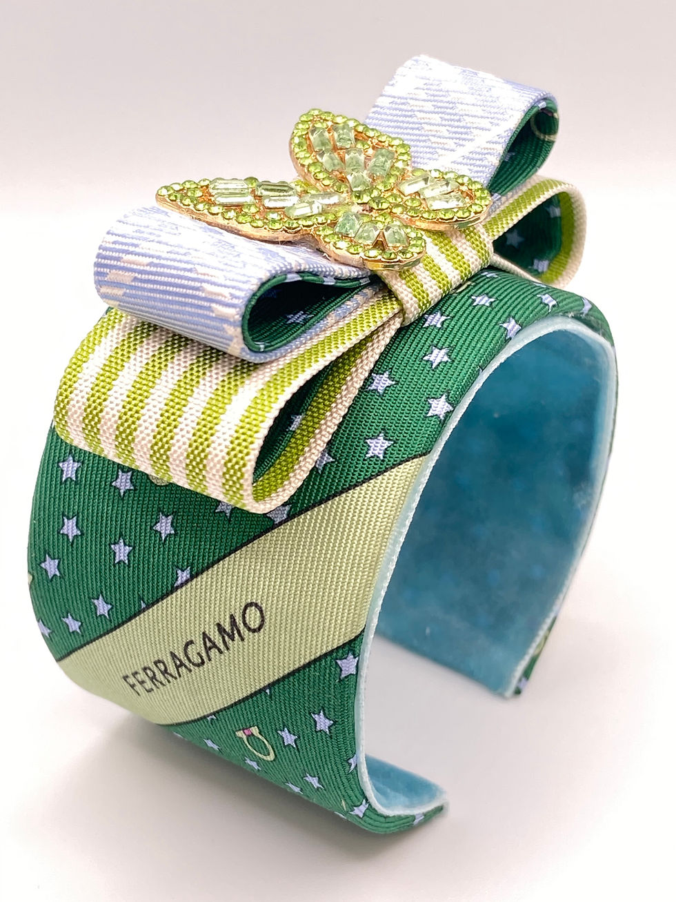 Green & blue cuff with a green butterfly made from a vintage Ferragamo silk tie